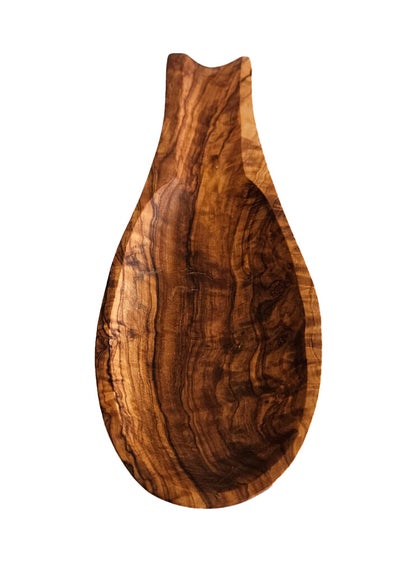 Handgefertigtes ovaler Apéro-Löffel aus einem rustikalen Olivenbaumstamm,einmalig behandelt mit Bienenwachs, um sein Aussehen und seinen natürlichen Geruch zu erhalten.
