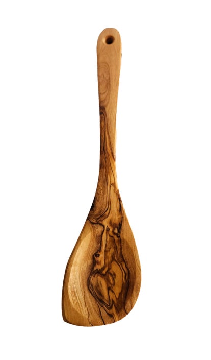 Handgefertigter Pfannenwender aus rustikalem Olivenholz! Einmalig behandelt mit Bienenwachs, um sein Aussehen und seinen natürlichen Geruch zu erhalten.