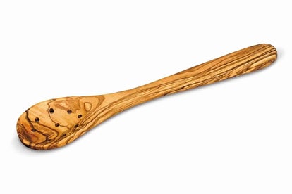 Handgefertigter großer Löffel mit Löchern aus rustikalem Olivenholz! Einmalig behandelt mit Bienenwachs, um sein Aussehen und seinen natürlichen Geruch zu erhalten.