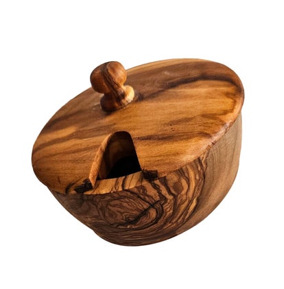 Handgefertigtes Gewürz-oder Salz-Fässchen aus rustikalem Olivenholz! Einmalig behandelt mit Bienenwachs, um sein Aussehen und seinen natürlichen Geruch zu erhalten.
