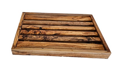 Handgefertigtes Brot-Schneidebrett mit herausnehmbaren Krümmelgitter aus einem rustikalen Olivenbaumstamm! Einmalig behandelt mit Bienenwachs, um sein Aussehen und seinen natürlichen Geruch zu erhalten.