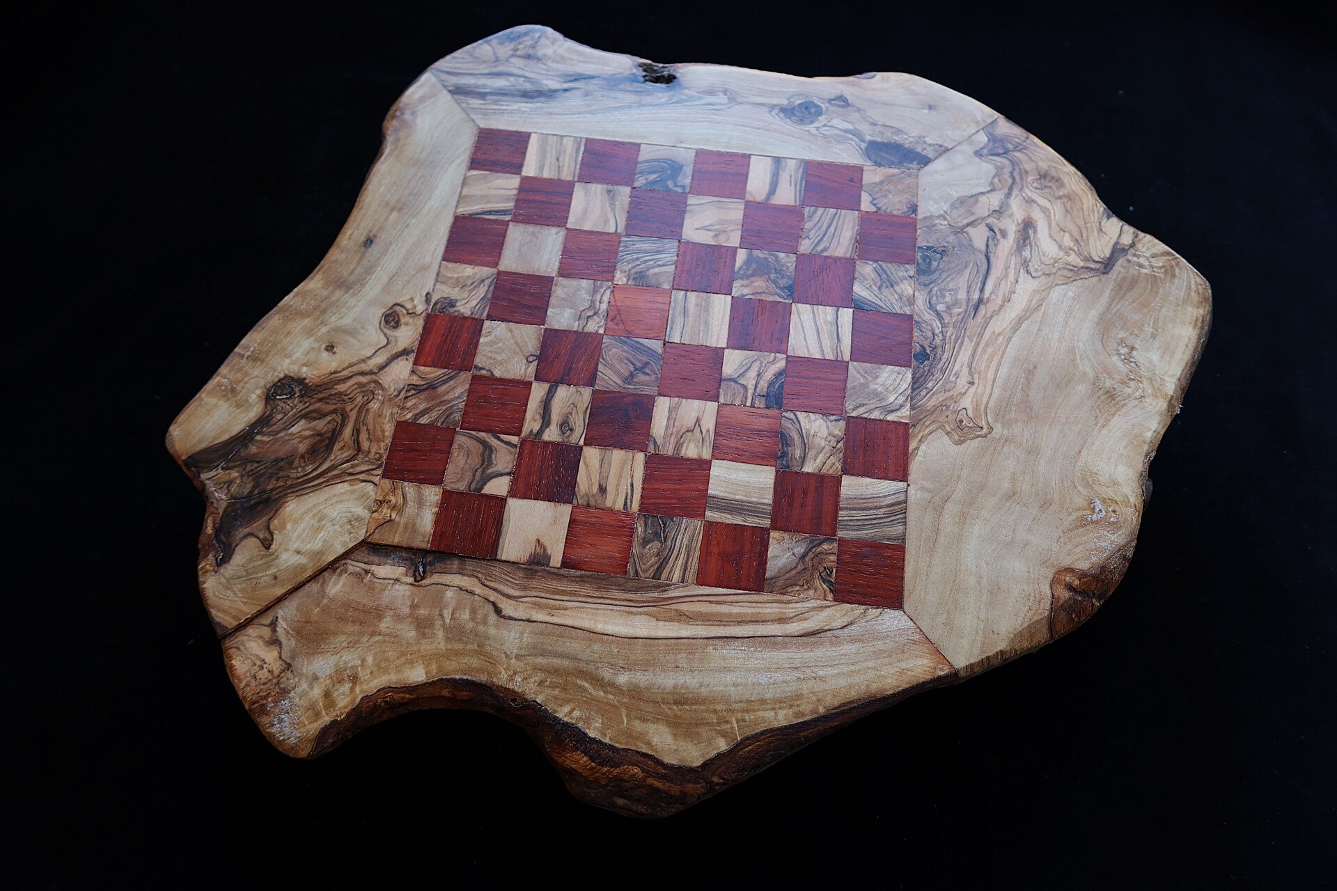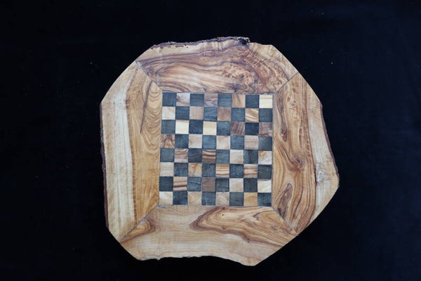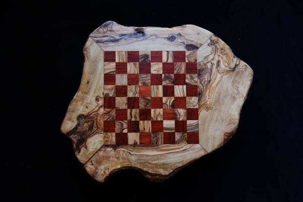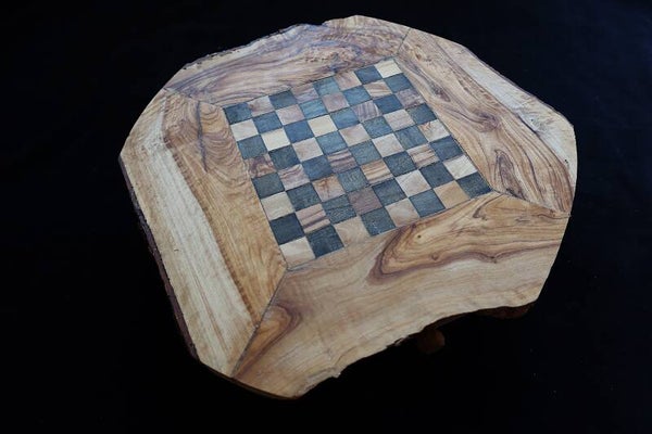 Handgefertigtes Schach-Brett inkl. reizender Figuren aus einem rustikalen Olivenbaumstamm! Ein wunderschönes Spiel aus der Natur. Einmalig behandelt mit Bienenwachs, um sein Aussehen und seinen natürlichen Geruch zu erhalten.